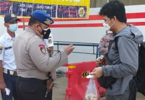 Di Dermaga Keberangkatan Kaliadem Muara Angke Polres Kepulauan Seribu bersama Instansi terkait setempat terus melakukan himbauan ProKes (Protokol Kesehatan). Minggu (26/09/2021).