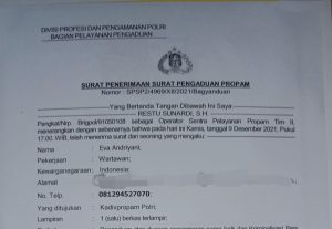” Saya sudah melaporkan secara resmi dengan Nomor : SPSP2/4969/XII/2021/Bagyanduan pada hari ini,yang di tangani oleh Brigpol. Restu Sunardi. SH.” kata Eva saat di konfirmasi awak media selesai proses pelaporan di Divpropam Mabes Polri, Kamis, (9/12/2021).