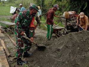 Makimi,Targethukum.com ~ Serka Sunar Maswatu Babinsa Koramil 1705-02/Napan melaksanakan karya bakti bersama warga Kampung Legari Jaya Distrik Makimi dengan sasaran pembuatan saluran irigasi sepanjang 150 meter, Minggu 6 Juni 2021.