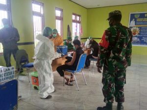 Waghete ,Targethukum.com- Babinsa Koramil 1703-02/Tigi Serda Thomas Rejau melaksanakan kegiatan monitoring pengamanan pemberian vaksinasi Covid-19 Tahap pertama pada masyarakat yang bertempat di Aula Kantor Dinas Kesehatan,Kabupaten Deiyai Jumat ( 23/07/2021 ).