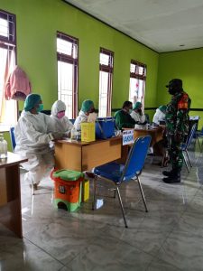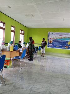 Babinsa melakukan pendampingan dalam pelaksanaan penyuntikan vaksinasi Covid-19 tahap I dan II untuk warga masyarakat yang dilakukan oleh petugas kesehatan puskesmas dan petugas kesehatan RSUD Kabupaten Deiyai.