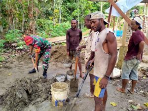 Dalam kegiatan pembangunan Pustu Marikai, Babinsa Serda Jainul menggunakan kesempatan ini untuk turut membantu proses pembangunan Pustu tersebut dengan masyarakat setempat di Kampung Marikai, Distrik Waropen Atas, Kab. Waropen, Rabu 08/12/2021.
