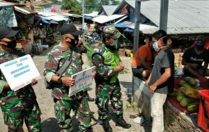 Dandim 0506/Tgr Kolonel Inf Bambang Hery Tugiyono melalui Danramil 04/Ciledug Kapten Inf Tarsan menjelaskan, Babinsa Kelurahan Larangan Koramil 04 Ciledug Serda Slamet mendatangi pasar tradisional untuk mengimbau warga tetap menjalankan Protokol kesehatan jangan berkerumun dan menjaga jarak.