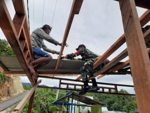 Yapen, Targethukum.com-Sebagai wujud pengabdian tanpa batas TNI kepada rakyat, Babinsa Koramil 1709-01/Yapsel Serda Mujianto membantu pemasangan atap rumah salah satu warga binaannya di Kampung Sarawandori 1, Distrik Kosiwo, Kab. Kep. Yapen, Minggu (06/06/2021).