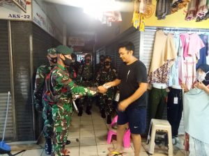 Ia juga menyampaikan bahwa para Babinsa dan personil BKO juga membagikan masker kepada pedagang maupun kepada pengunjung pasar.