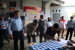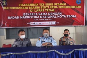 Lembaga Pemasyarakatan (Lapas) Kelas IIB bersinergi dengan Badan Narkotika Nasional (BNN) Kota Tegal dan Polres Tegal Kota melaksanakan kegiatan Tes Urine bagi pegawai lapas dan pemusnahan barang bukti yang ditemukan dari hasil penggeledahan blok hunian warga binaan lapas, Kamis (24/2/2022).