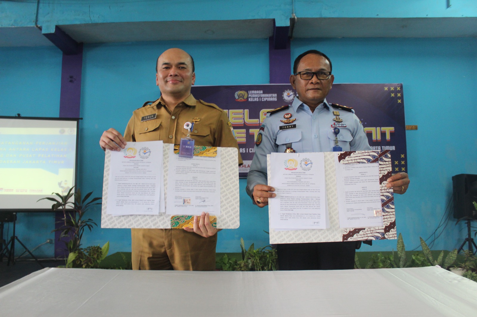 Penandatangan MOU antara Tonny Nainggolan selalu Kepala Lembaga Pemasyarakatan kelas I Cipinang dan Teguh Hendarwan selaku Kepala Pusat Pelatihan Kerja Daerah Jakarta Timur dilaksanakan secara hikmat dan lancar.
