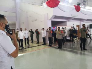 Kodam Jaya – Tigaraksa,Targethukum.com – Dandim 0510/Trs Letkol Inf Bangun I E Siregar mengambil langsung apel pengamanan dan mengatur jarak Prokes dalam dalam acara Penyambutan Presiden RI Ir. H Joko Widodo dalam rangka vaksinasi massal masyarakat dan pelayanan Publik di Sport Center Desa Bonang Kecamatan kelapa Dua, Kabupaten Tangerang,