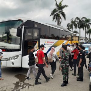 Dandim 0510/Trs Letkol Inf Bangun I E Siregar memantau langsung keberangkatan massa SP/SB PUK Kasbi PT. Victory Chingluh Indonesia Pasar kemis Kabupaten Tangerang ke Jakarta dalam rangka aksi memperingati Hari buruh sedunia (May Day) TA. 2021, Sabtu (01/05/2021).