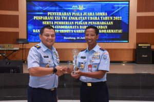 Bandung,targethukum.com-Koharmatau. Ketua Pesparani Koharmatau Kolonel Tek Stevanus Ervin Suryadi, S.T. menyerahkan piala juara lomba Pesparani XXI TNI Angkatan Udara Tahun 2022 kepada Komandan Koharmatau Marsda TNI Eddy Supriyono, S.E., M.M., di Gedung Boediardjo Makoharmatau. Rabu (20/7/2022).