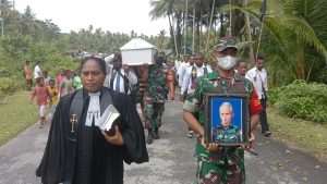 Danpos Ramil 1708-02/Bu-Warsa Serma Ahmat Sakka beserta 4 orang anggota Babinsa menghadiri sekaligus membantu prosesi acara pemakaman Purnawirawan Koptu Mathinus Pombos yang meninggal dunia karena sakit, di Kampung Wandos, Distrik Bondifuar, Kab. Biak Numfor, Sabtu (11/12/21).