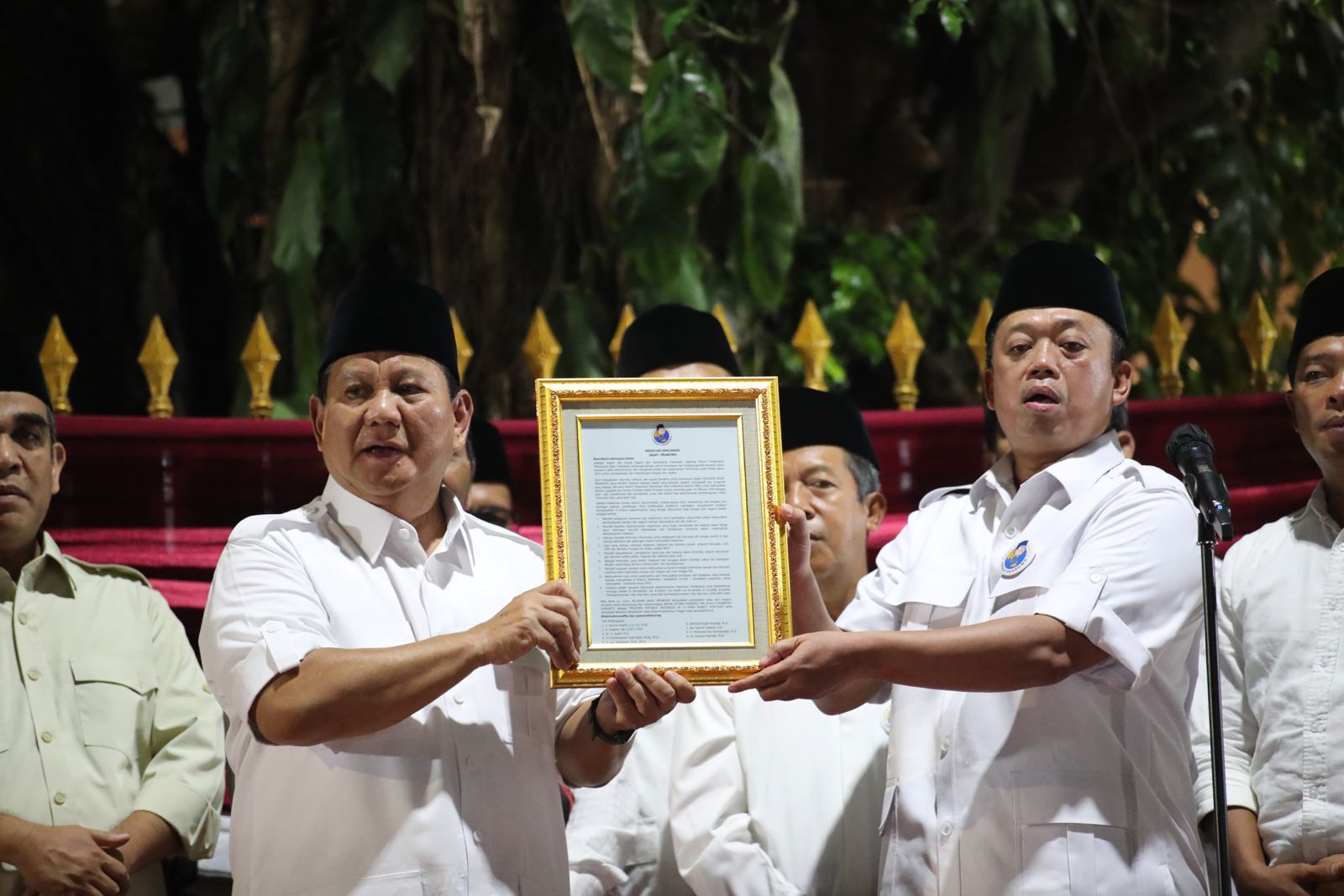 Bakal calon presiden (bacapres) Prabowo Subianto menerima deklarasi dukungan dari relawan pada dedengkot Pergerakan Mahasiswa Islam Indonesia (PMII) dan pemuda Nahdlatul Ulama (NU), Jagat Prabowo di Jalan Kertanegara no.4, Jakarta Selatan, Kamis (19/10).