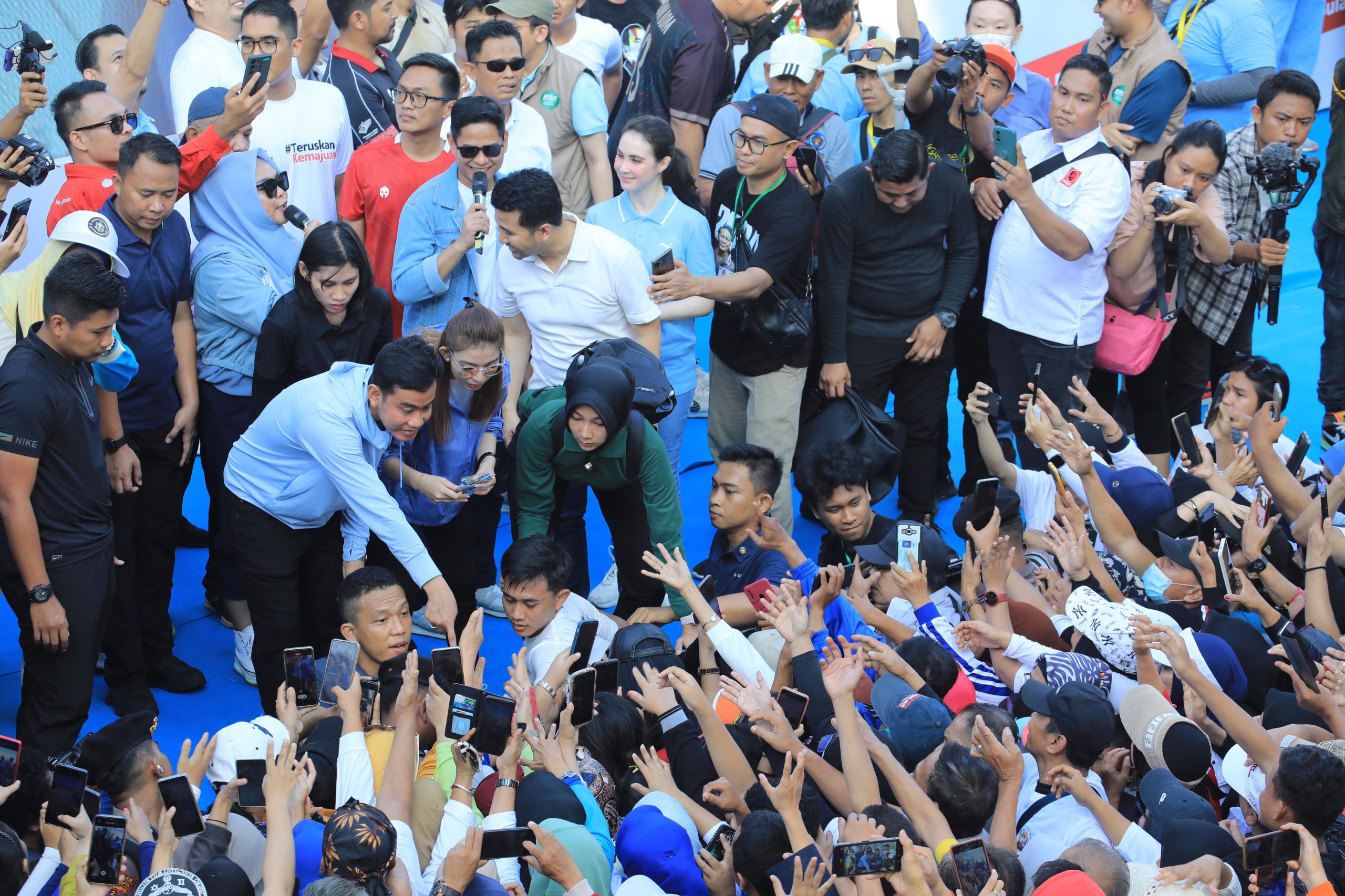 Sekjen Partai Gerindra Ahmad Muzani bersama Calon wakil presiden nomor urut 2, Gibran Rakabuming Raka menghadiri acara jalan sehat bersama puluhan ribu masyarakat Sulawesi Selatan di Jalan Jendral Sudirman, Kota Makassar, Sabtu (25/11).