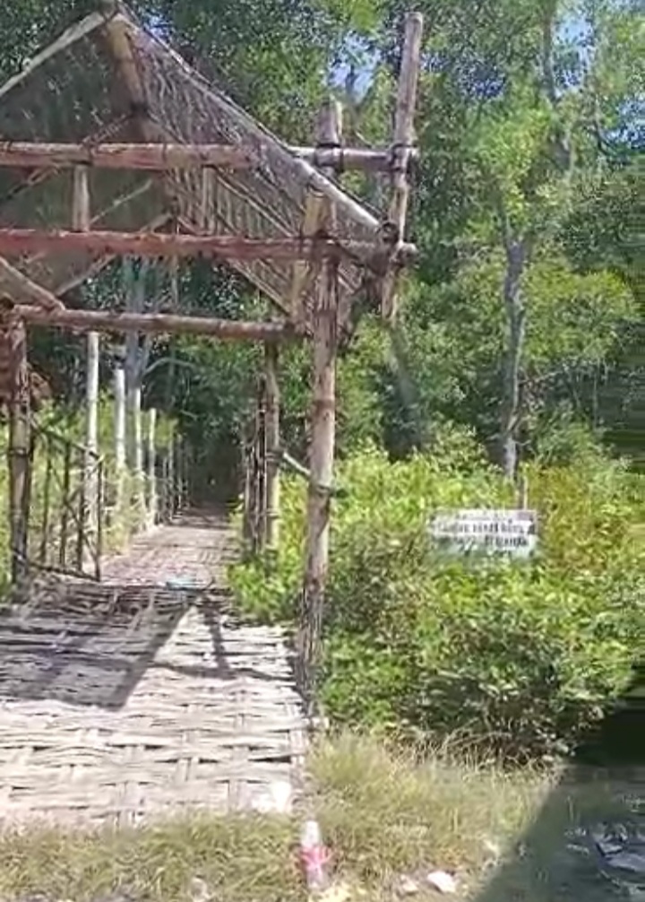 Mulai dari Pos masuk ke lokasi bakau hingga jembatan menjorok ke hutan Bakau yang terbuat dari bambu itu sudah rusak dan acak acakan tak terawat
