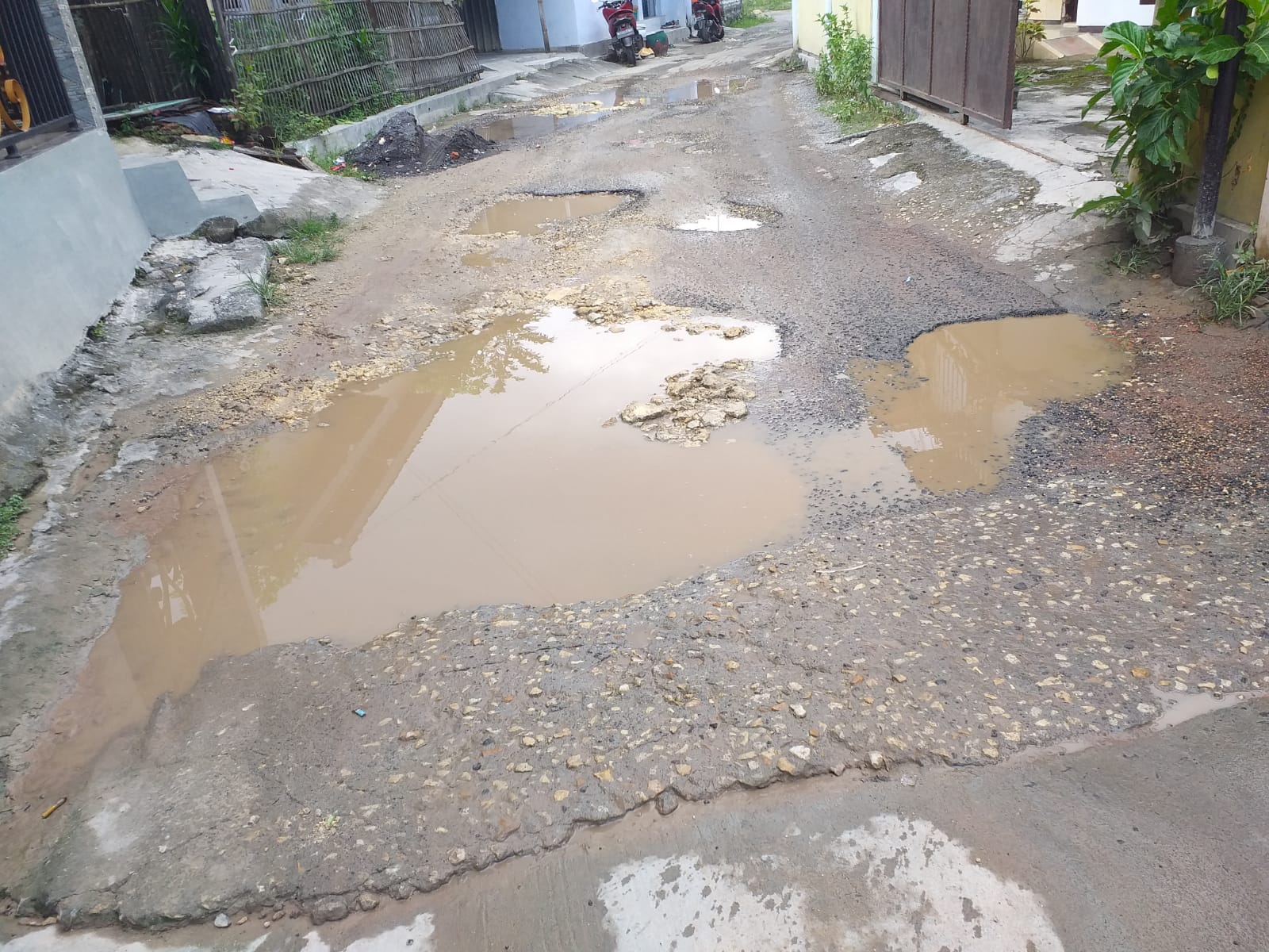 Selain tidak rata karena perbaikan tambal sulam atas inisiatif RT dan warga terhadap sebagian jalan, kondisi jalan itu tinggal tanah dan kerikil dengan banyak lubang menganga