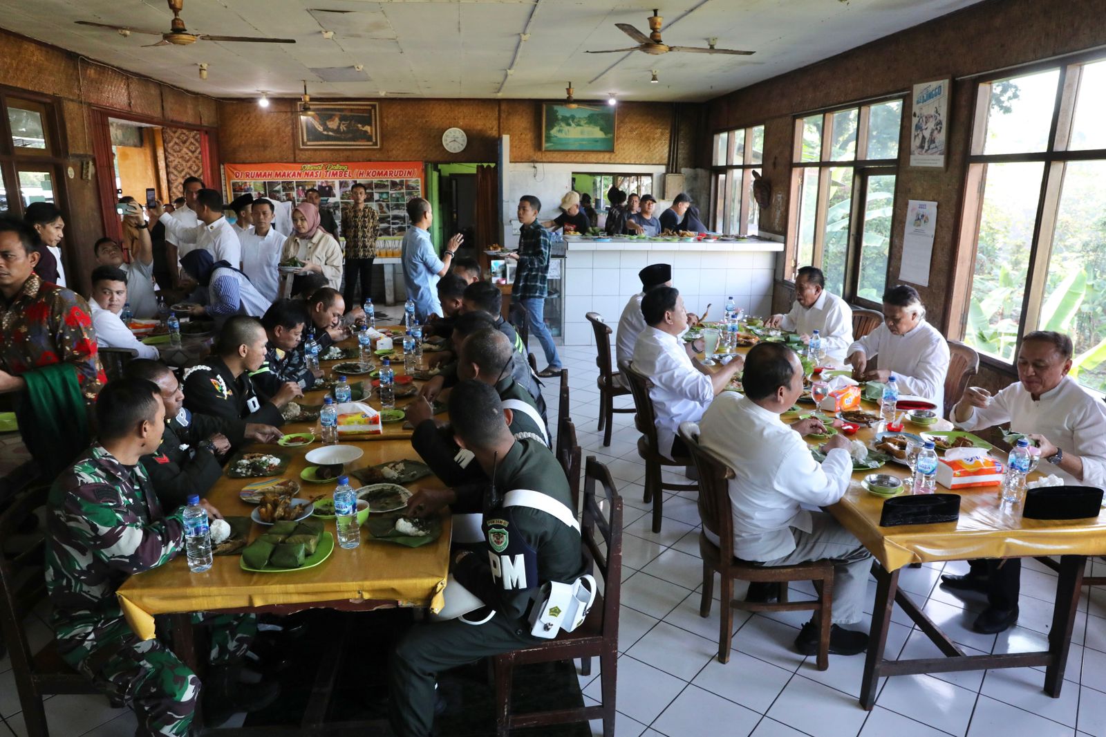 Menu makan yang disantap yakni nasi timbel yang merupakan salah satu makanan khas Jawa Barat, yang penyajiannya dibungkus dengan menggunakan daun pisang berbentuk bulat lonjong menyerupai timbel. Prabowo pada kesempatan itu juga didampingi oleh Dedi Mulyadi dan Iwan Bule.