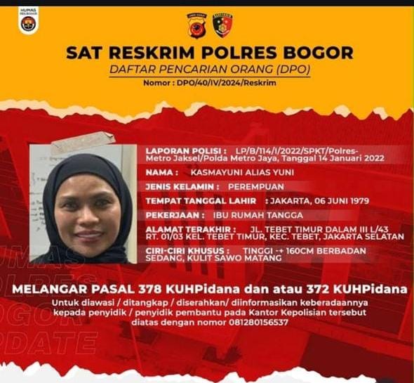 Humas Polres Bogor menyiarkan Daftar Pencarian Orang (DPO) dengan nomor DPO/40/IV/2024/RESKRIM melalui media sosial (medsos) Instragram pada September 2024. Terduga pelaku seorang wanita bernama Kasmayuni alias Yuni usia 46 tahun. Yuni disangkakan kasus penipuan, melanggar pasal 378 KUHPidana dan pasal 372 KUHPidana, dimana postingan itu dikunjungi 2.327 netizen dengan komentar 117 dan dibagikan sebanyak 118 kali.