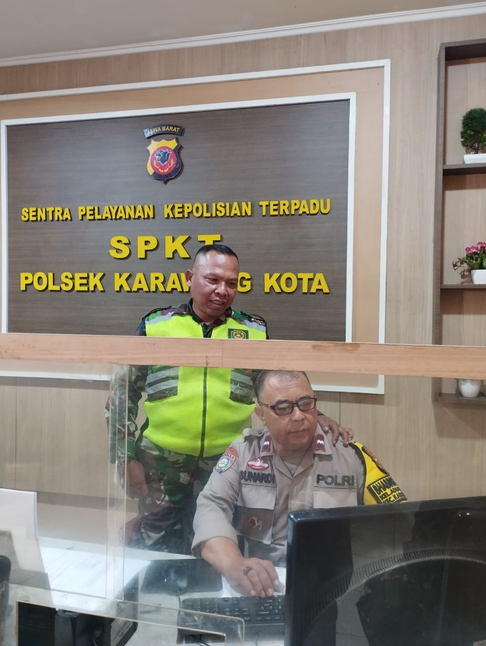 Para personel 0401/Kota, Kodim 0604/Karawang berikan kejutan dan sampaikan ucapan Hari Jadi Bhayangkara ke-77 dengan mengunjungi Mapolsek Karawang Kota dan Majalaya, Senin (03/07/23).