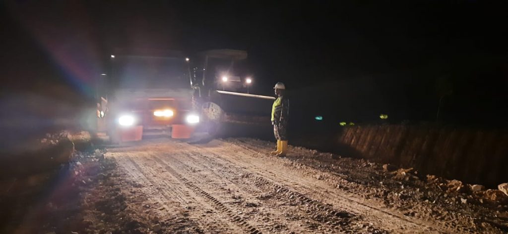 Hingga tengah malam pengerjaan terus dilakukan Satgas TMMD Ke 110 Kodim 0318/Natuna membangun jalan penghubung dua Desa di dua Kecamatan sepanjang 2000 meter di Dusun Sebayar Desa Sungai Ulu Kecamatan Bunguran Timur Kabupaten Natuna, (28/3/2020) dini hari.
