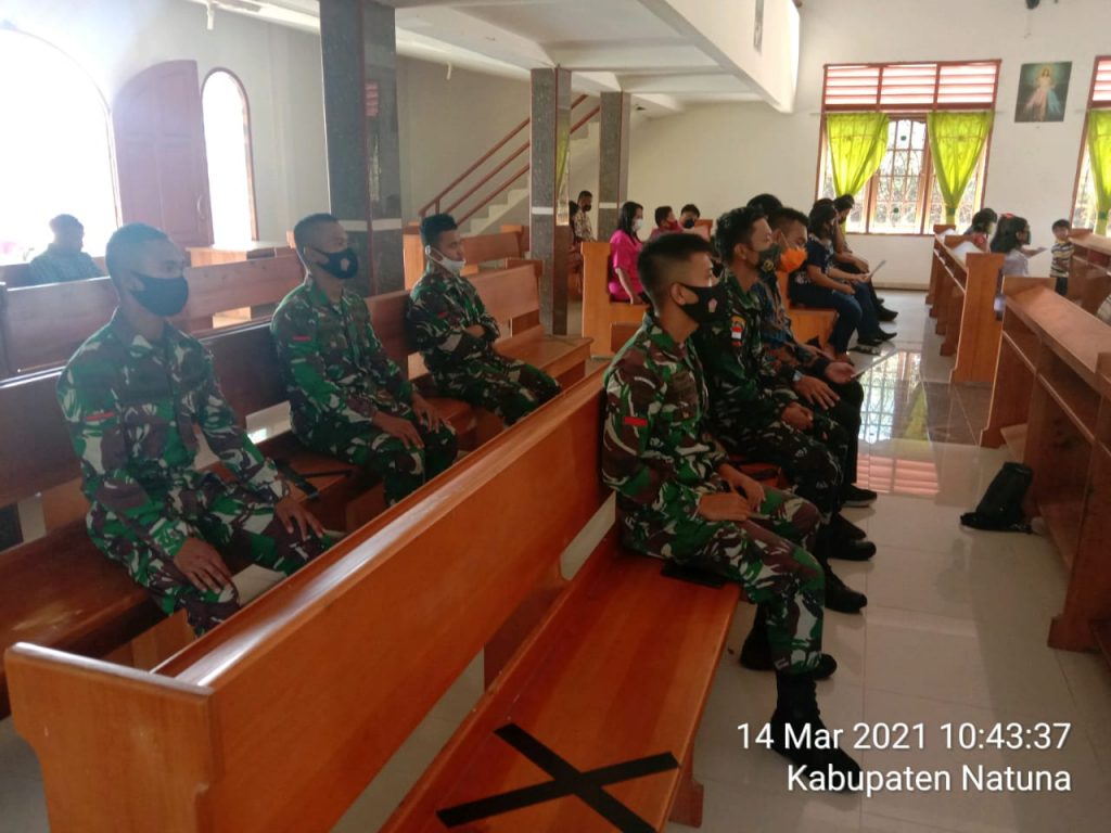 Anggota Satgas TMMD ke-110 Kodim Natuna Ibadah Bersama Masyarakat Ranai Kabupaten Natuna di Gereja Protestan Indonesia, Minggu (14/03/2021).