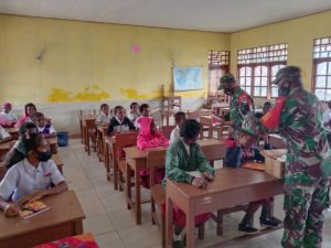 Tigi ,Targethukum.com-Tak ingin ana- anak di sekolah terkena dampak dari penyebaran Virus Corona (Covid-19), Sertu Suherman bersama rekan Babinsanya Serda Yohanes Pakage Babinsa Koramil 1703-02/Tigi membagikan masker gratis kepada anak-anak Sekolah SD Negeri 01 Waghete Kampung Waghete Satu, Distrik Tigi,Kabupaten Deiyai. Senin (30/08/2021 ).