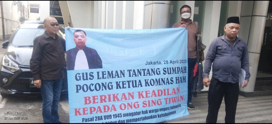 Jakarta, Targethukum.com — Kuasa Hukum Ong Sing Tjwan, Gus Leman, mendatangi Kantor Komnas HAM pada Senin, 28 April 2025, pukul 14.30 WIB. Kehadirannya merupakan bentuk pembuktian atas pernyataannya untuk menantang Komnas HAM melakukan sumpah pocong, sebagai bentuk kekecewaannya terhadap sikap lembaga tersebut.