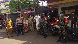 Dua anggota Koramil 01/ Tamansari Kodim 0503/Jakarta Barat, Babinsa Kel.Tamansari Serka Agus dan Serka Mukoddas bersama tiga pilar Kec. Tamansari melaksanakan Penyemprotan Cairan Desinfektan.