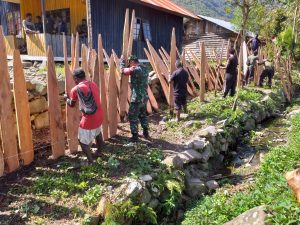Mulia,Targethukum.com-Babinsa Koramil 1714-01/Mulia A.n Serda Gideon Paledung dan 3 orang anggota lainnya, Melaksanakan Karya Bhakti bersama masyarakat di kampung Trikora Distrik Mulia membuat pagar untuk kantor Kepala Kampung Trikora. 3 Mei 2021