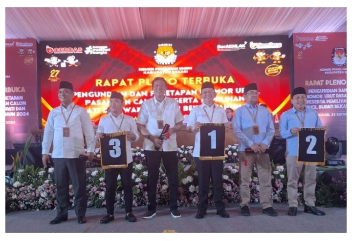 Komisi Pemilihan Umum (KPU) Kabupaten Bekasi menggelar rapat pleno terbuka pengundian dan penetapan nomor urut pasangan calon peserta pemilihan Bupati dan Wakil Bupati Bekasi pada pemilihan kepala daerah (Pilkada) serentak 27 November 2024.