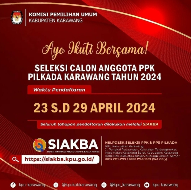 Hari ini, tanggal 23 April 2024, telah dimulai proses seleksi calon anggota Panitia Pemilihan Kecamatan (PPK) dan PPS untuk Pemilihan Kepala Daerah (Pilkada) tahun 2024. Proses seleksi ini akan berlangsung hingga tanggal 29 April 2024. Seleksi ini merupakan salah satu tahapan penting dalam persiapan Pilkada 2024.