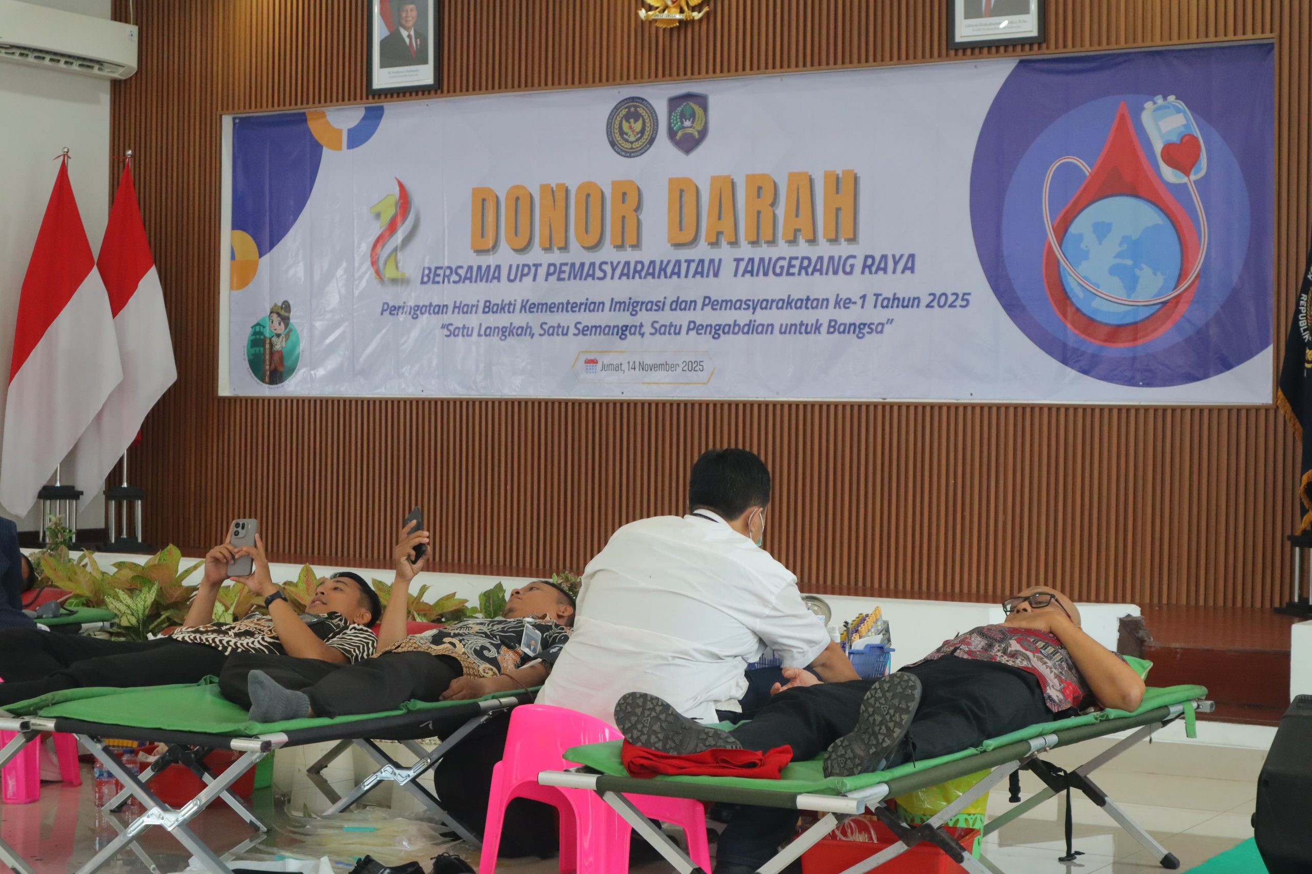 Lapas Kelas I Tangerang turut mengambil bagian dalam kegiatan Donor Darah Bersama UPT Pemasyarakatan se-Tangerang Raya yang dipusatkan di Lapas Perempuan Kelas IIA Tangerang, Jumat (14/11). Kegiatan yang digelar dalam rangka memperingati Hari Bakti Pemasyarakatan ke-1 Tahun 2025 ini menjadi momentum bagi jajaran Pemasyarakatan untuk berkontribusi langsung dalam pemenuhan kebutuhan darah bagi masyarakat.