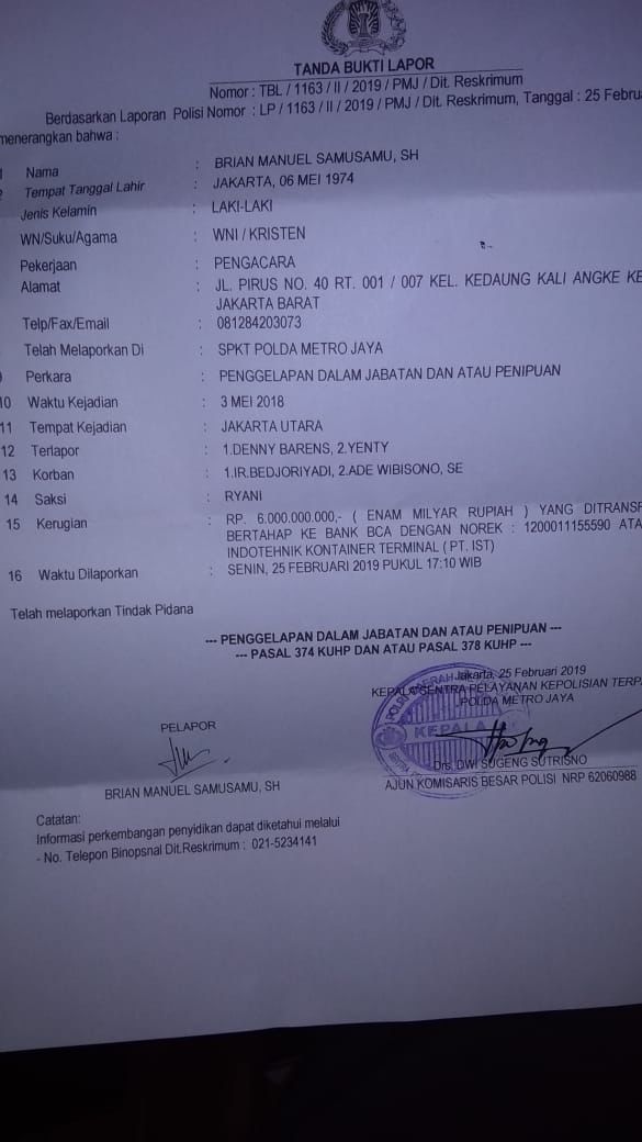 Laporan Kepolisian di Dit Krimum Polda Metro Jaya dengan Nomor LP/1163/II/2019/PMJ/Dit.Krimum tertanggal 25 Februari 2019.
