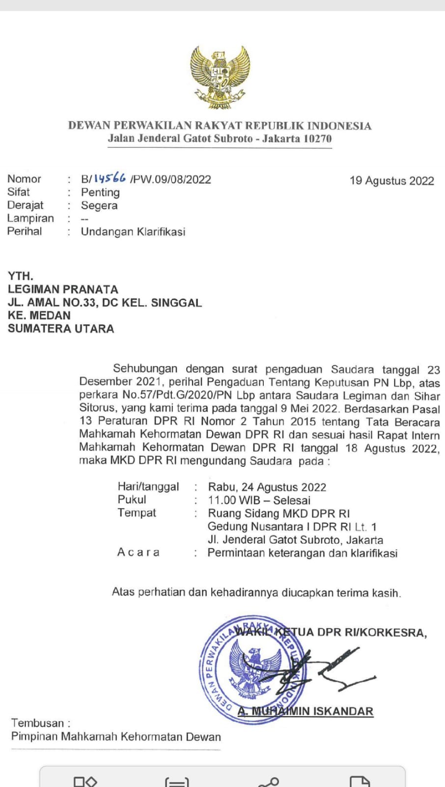 Surat panggilan MKD terhadap Legiman Pranata yang ditandatangani oleh Muhaimin Iskandar