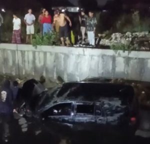 Mobil Xania hitam nopol M 1419 TX milik Amir 25 warga dusun Tattat Kelurahan Karang Dalam terperosok hingga tercebur di parit