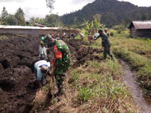 Aradide Papua, Targethukum.com-Agar terwujud kemanunggalan TNI dengan rakyat, aparat Babinsa Koramil 1703-04/Komopa bersama masyarakat melaksanakan Karya bakti pembuatan lahan kebun untuk ditanami ubi, bertempat dikampung