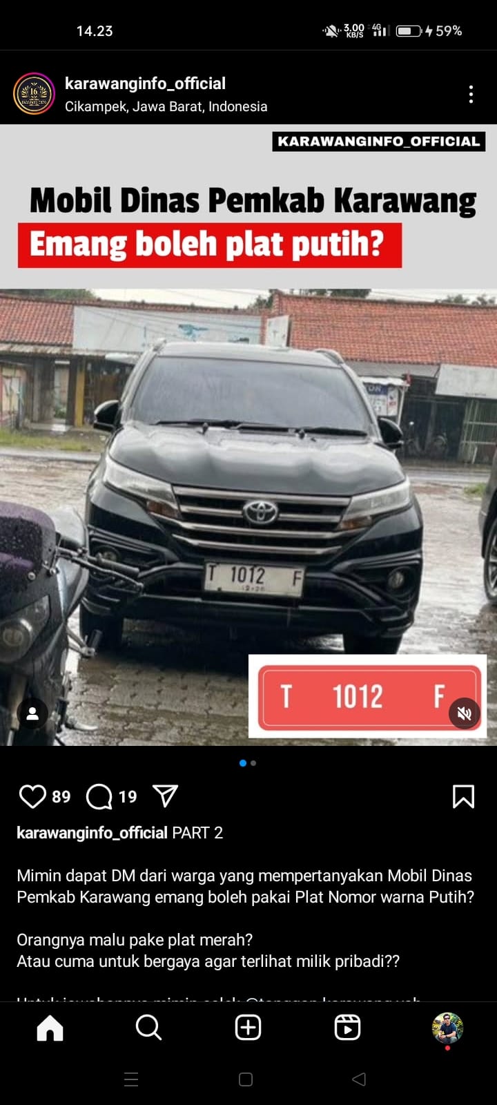 “Karawang tea, sering melihat pelat merah pakai akrilik. Pokoknya mah poek (gelap) gak kelihatan, kelihatan kalau kena sorot lampu. Dilakukan penindakan gak ini, Min? Selanjutnya bagaimana?” tanya akun adang.ahmad.5473.