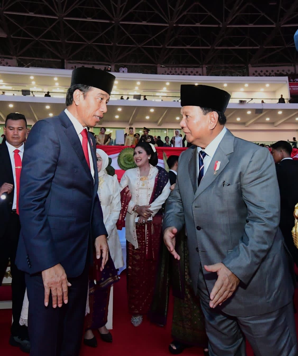 Kemudian, Prabowo mendampingi Jokowi beriringan memasuki area acara di Gelora Bung Karno, Senayan.