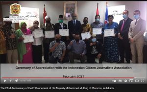 For all parties, especially journalists and reporters, who did not have time to watch the event lively, you can watch the video of the event on the following Youtube page of the Moroccan Embassy. At the end part of the video, various activities of the Moroccan Embassy were shown, including the ‘Ceremony of Appreciation with The Indonesian Citizen Journalists Association’ which was held by the Moroccan Embassy with PPWI on February 4, 2021.