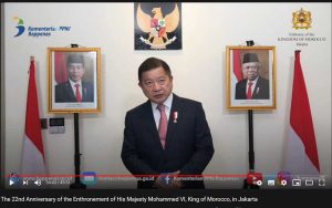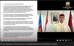 Targethukum.com,Jakarta – The Moroccan Embassy in Indonesia celebrated the National Day of the Kingdom of Morocco on Friday, July 30, 2021, at the Moroccan Ambassador’s Official Residence, South Jakarta. The celebration of Morocco’s National Day, which marks the 22nd anniversary of King Mohammed VI ascending the throne as King of Morocco, can be watched online virtually on youtube.