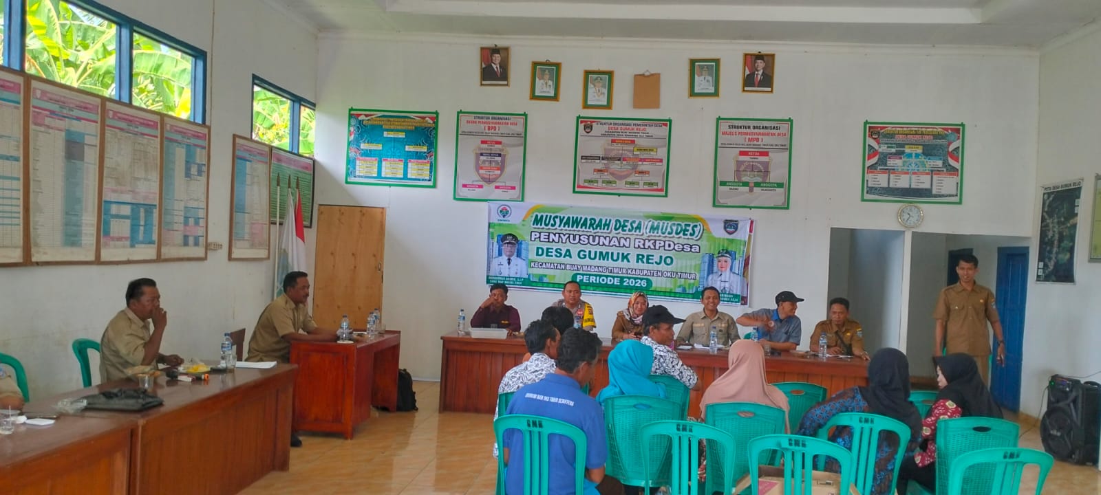 OKU Timur ,www.targethukum.com– Pemerintah Desa Gumuk Rejo, Kecamatan Buay Madang Timur, Kabupaten OKU Timur, menggelar Musyawarah Rencana Pembangunan Desa (Musrenbangdes) dalam rangka penetapan Rencana Kerja Pemerintah Desa (RKPDes) Tahun 2026, Senin (27/10/2025) pagi. Kegiatan berlangsung di Aula Balai Desa Gumuk Rejo dan dihadiri oleh unsur pemerintahan serta perwakilan masyarakat.
