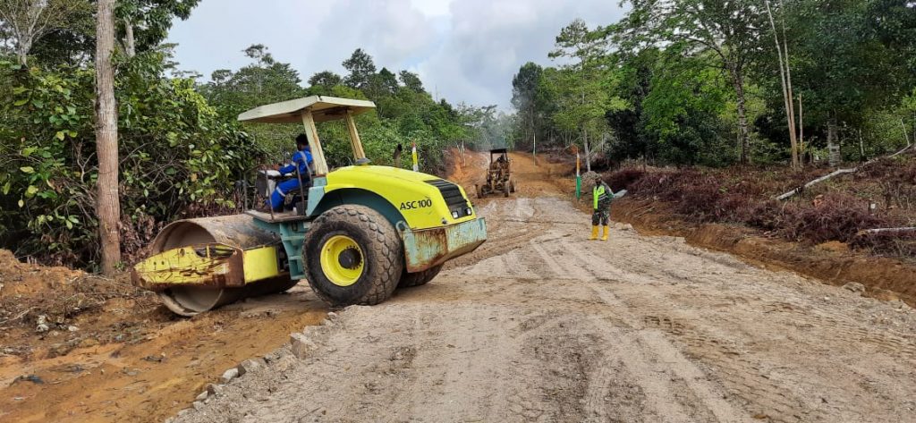 Kesibukan pengerasan jalan penghubung sepanjang 2000 meter di Dusun Sebayar Desa Sungai Ulu Kecamatan Bunguran Timur menuju Desa Selemam dalam kegiatan TMMD ke 110 Kodim 0318 Natuna terus dilakukan. Nampak truk betmuatan material beserta beberapa alat berat tengah melakukan aktifitasnya, Jumat 26 Maret 2021.