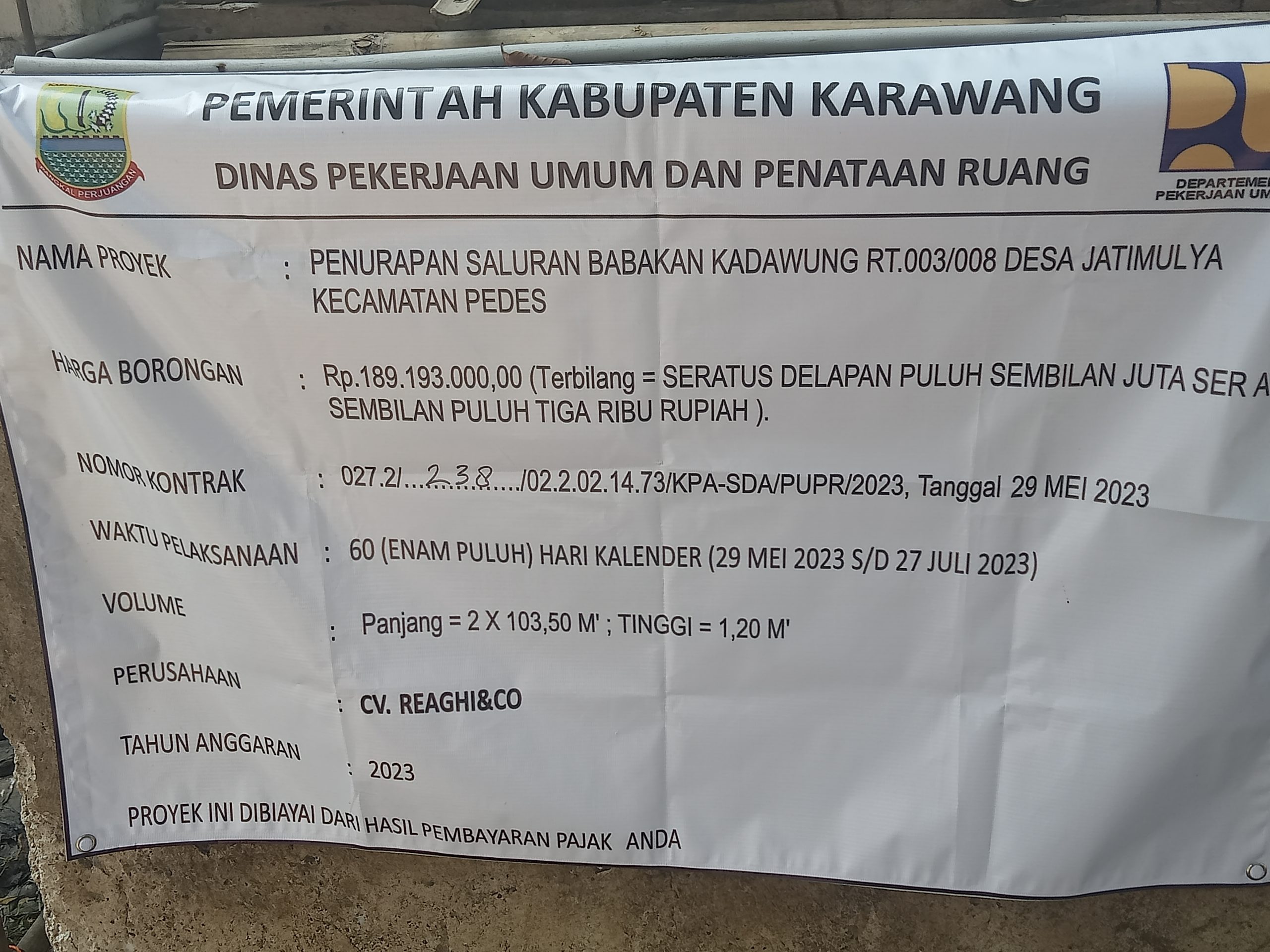 Di jelaskan bahwa Penurapan saluran Babakan Kedawung RT 003 RW 008 Desa Jatimulya Kecamatan Pedes dengan nomer kontrak 027.2/238/02.2.02.14.73/KPA-SDA/PUPR/2023 tanggal 29 Mei 2023,dengan harga borongan Rp.189.193.000.00 lama pelaksanaan 60 hari kalender (29 Mei 2023 s/d 27 Juli 2023) dengan volume Panjang : 2×103,50 M ; Tinggi :1,20 M dan CV .REAGHI&CO selaku pelaksana