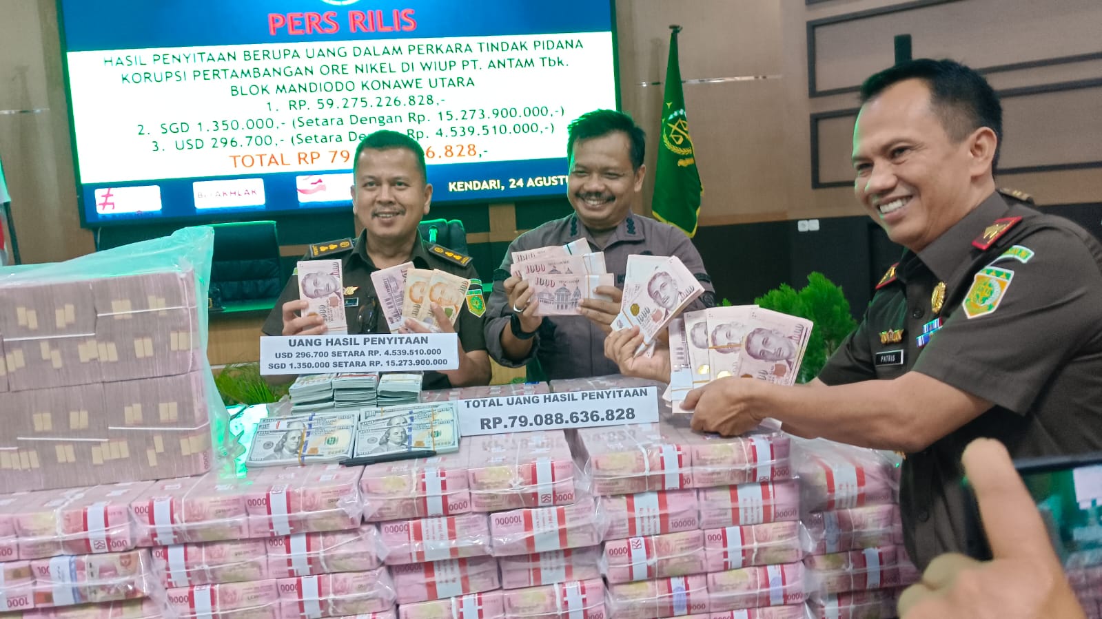 Penyidik Kejaksaan Tinggi Sulawesi Tenggara pada hari ini, Kamis (24/8-2023), mengumumkan Hasil Penyitaan Berupa Uang dalam Perkara Tindak Pidana Korupsi Pertambangan Ore Nikel pada WIUP PT. Antam Tbk di Blok Mandiodo Konawe Utara, dengan rincian sebagai berikut: