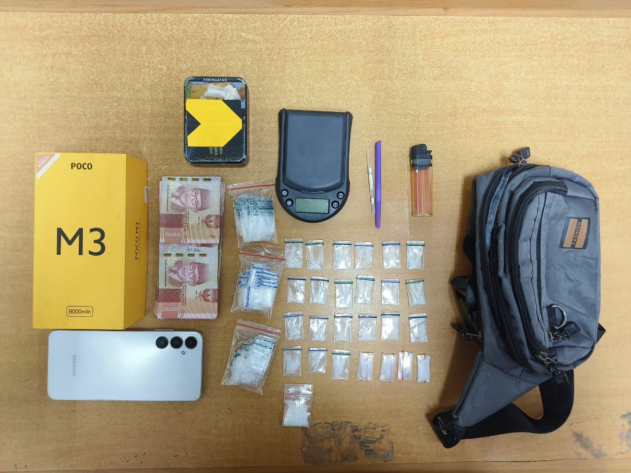 Selain sabu, turut diamankan timbangan digital, plastik klip, alat takar, uang tunai Rp1 juta, serta satu unit handphone yang diduga digunakan untuk transaksi.
