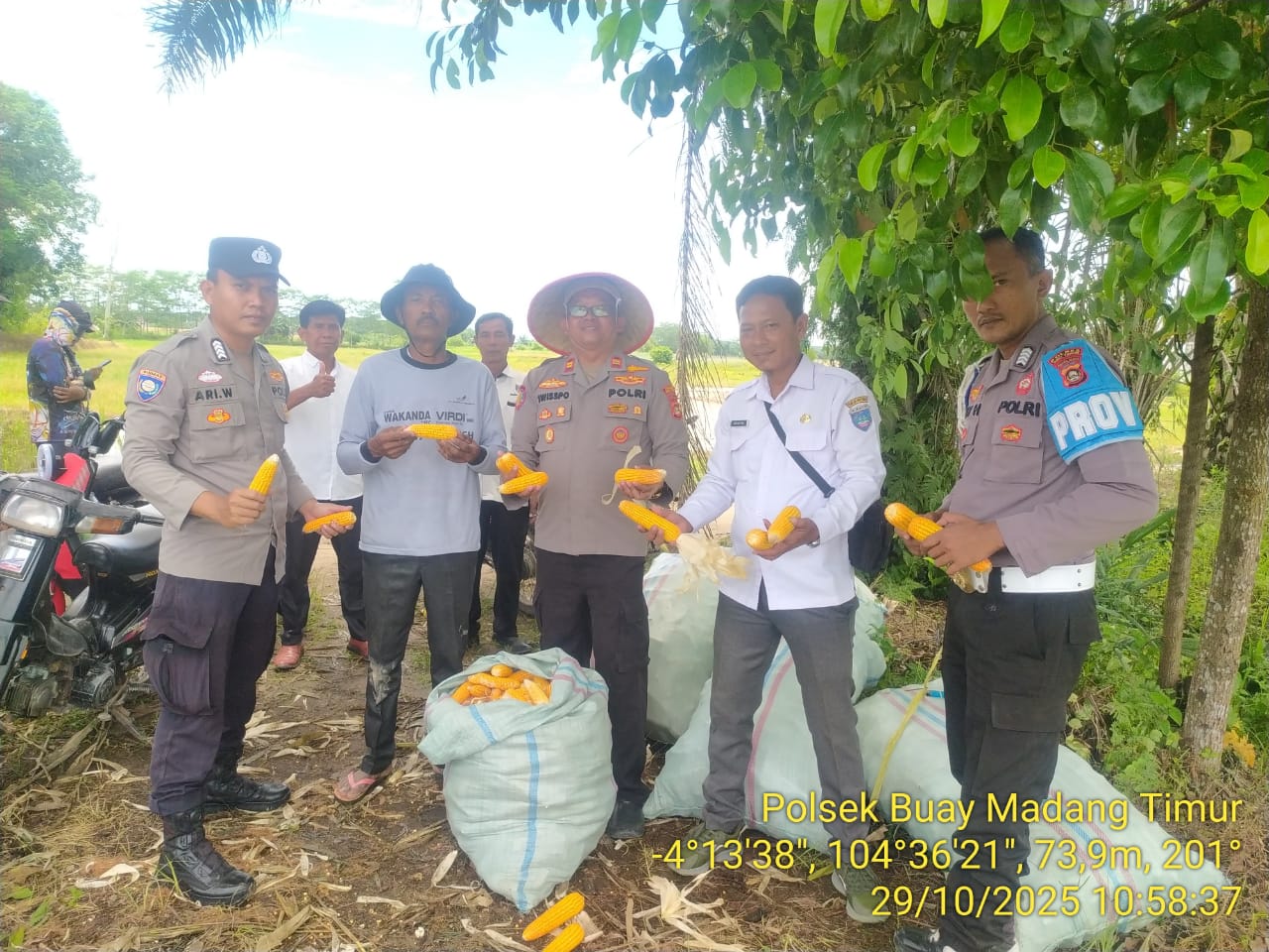OKU Timur | www.targethukum.com – Dalam rangka mendukung ketahanan pangan nasional, Polsek Buay Madang Timur Polres OKU Timur melaksanakan kegiatan Panen Jagung Kuartal III di lahan jagung milik warga di Desa Berasan Mulya, Kecamatan Buay Madang Timur, Kabupaten OKU Timur, pada Rabu (29/10/2025).