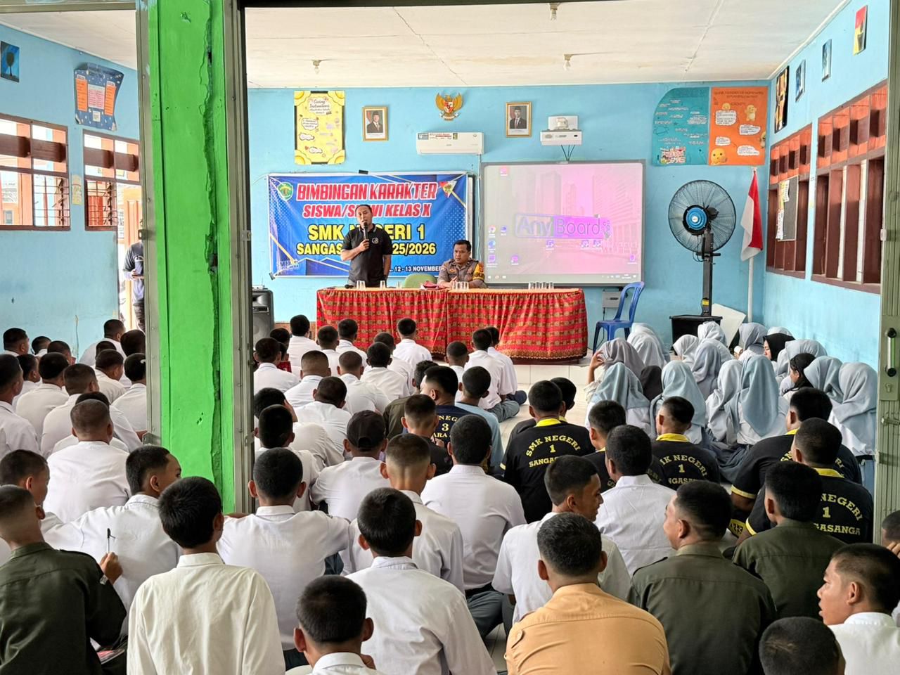 Kukar ,Targethukum.com- Dalam rangka mendukung program Penguatan Pendidikan Karakter (PPK) di lingkungan sekolah, Polsek Sangasanga melaksanakan kegiatan sosialisasi bertema “Bahaya Narkoba dan Tertib Berlalu Lintas” di SMKN 1 Sangasanga, Kelurahan Sangasanga Dalam, Kecamatan Sangasanga, Kabupaten Kutai Kartanegara, pada Rabu (12/11/2025) siang.
