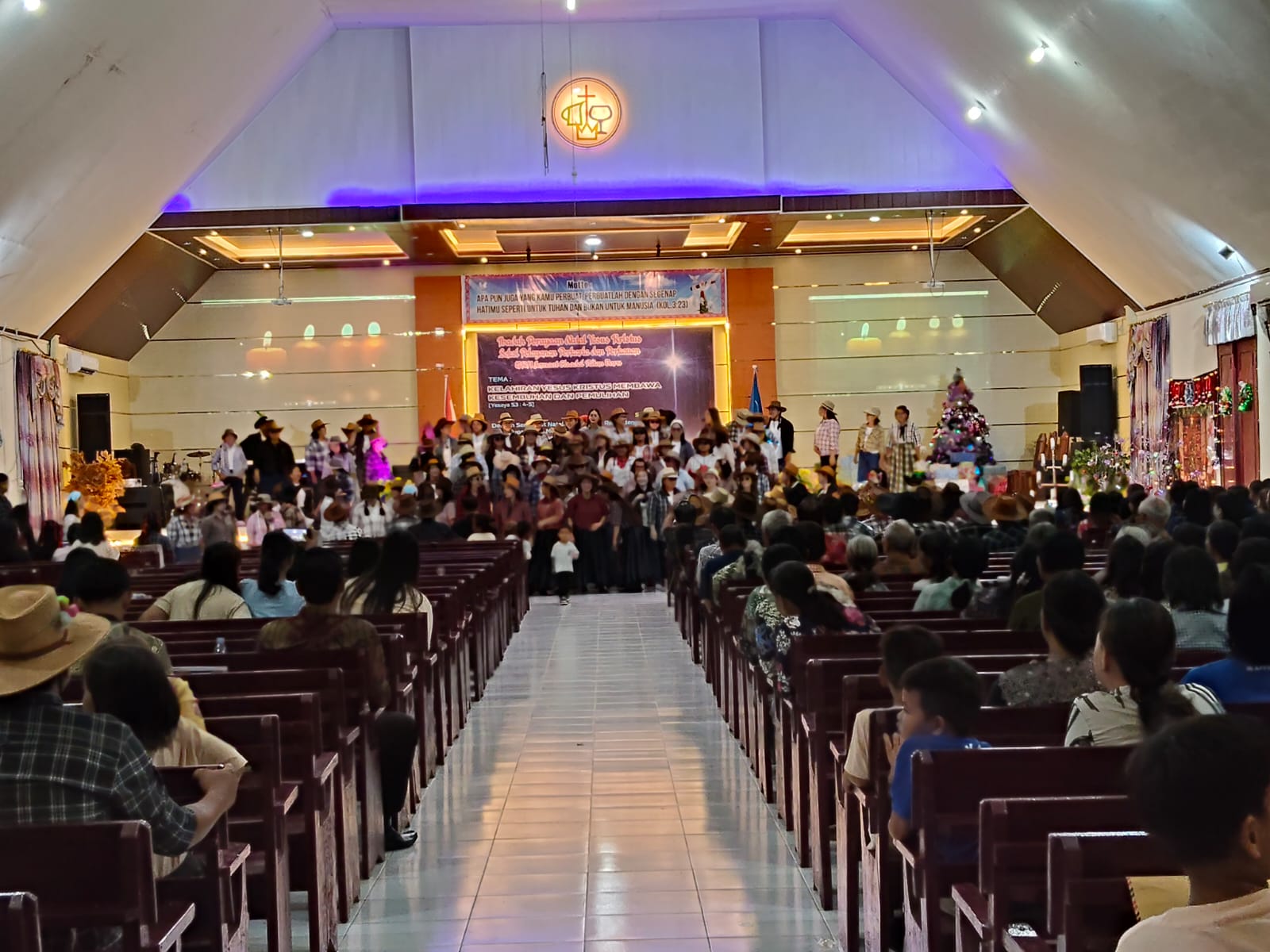 Ibadah Natal yang dimulai sekitar pukul 20.00 WITA tersebut diikuti kurang lebih 300 jemaat dan berlangsung dengan khidmat serta penuh sukacita. Kegiatan dipimpin oleh Pdt. Marison Sia, M.Th dan Pdt. Musa Levin, M.Th, dengan mengangkat tema “Kelahiran Yesus Kristus Membawa Kesembuhan dan Pemulihan.”