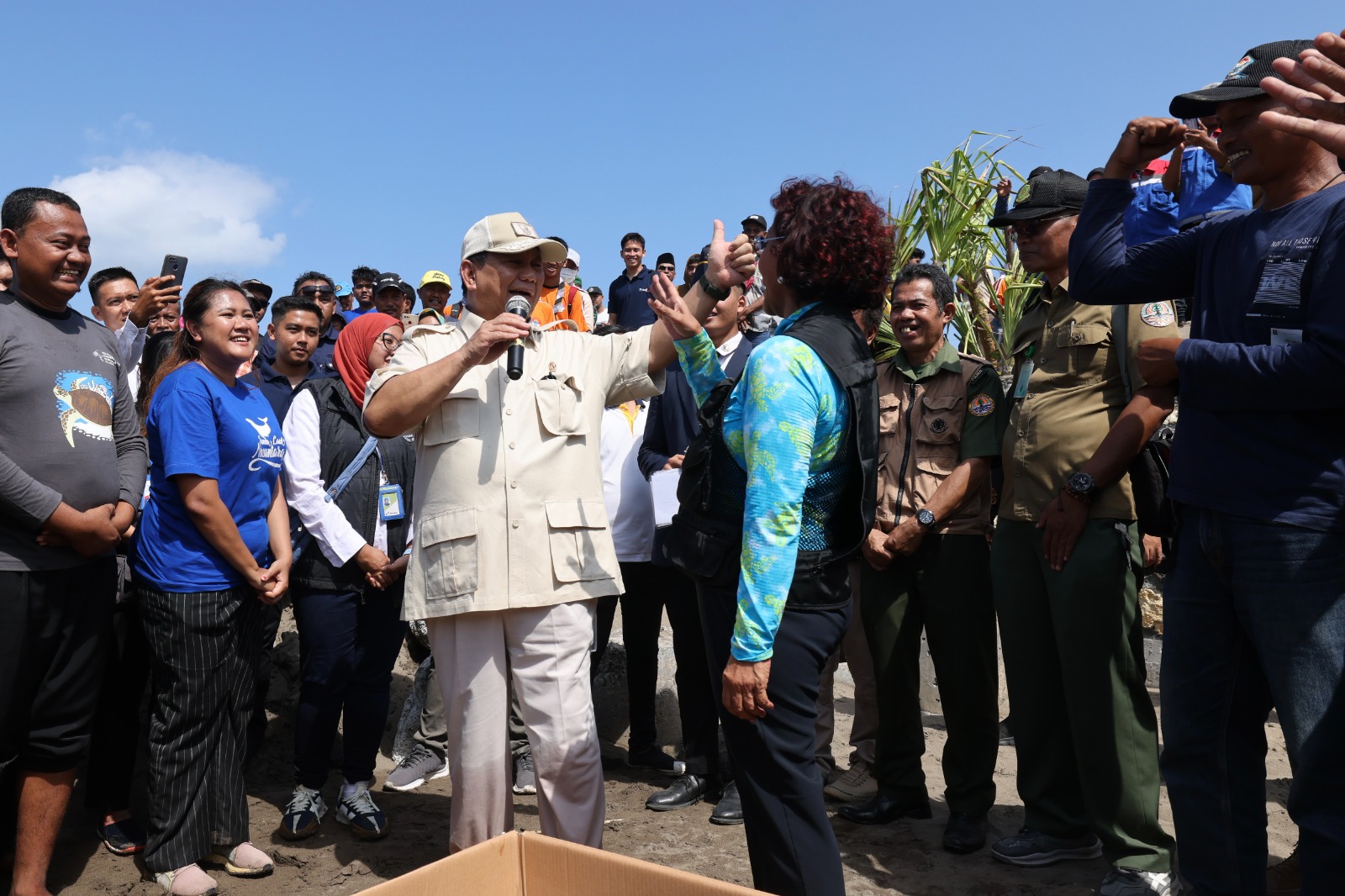 Saat bersalaman dengan masyarakat, riuh suara warga dan nelayan meneriakkan dukungan kepada Prabowo. “Hidup Prabowo, hidup presiden,” kata salah satu warga yang hadir.