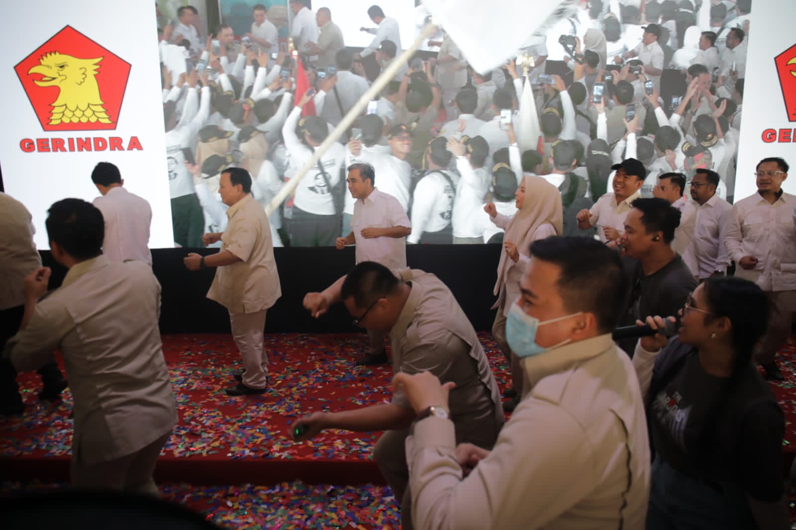 Prabowo pada kesempatan itu menari di samping Muzani. Para kader muda Gerindra juga turut menari bersama.