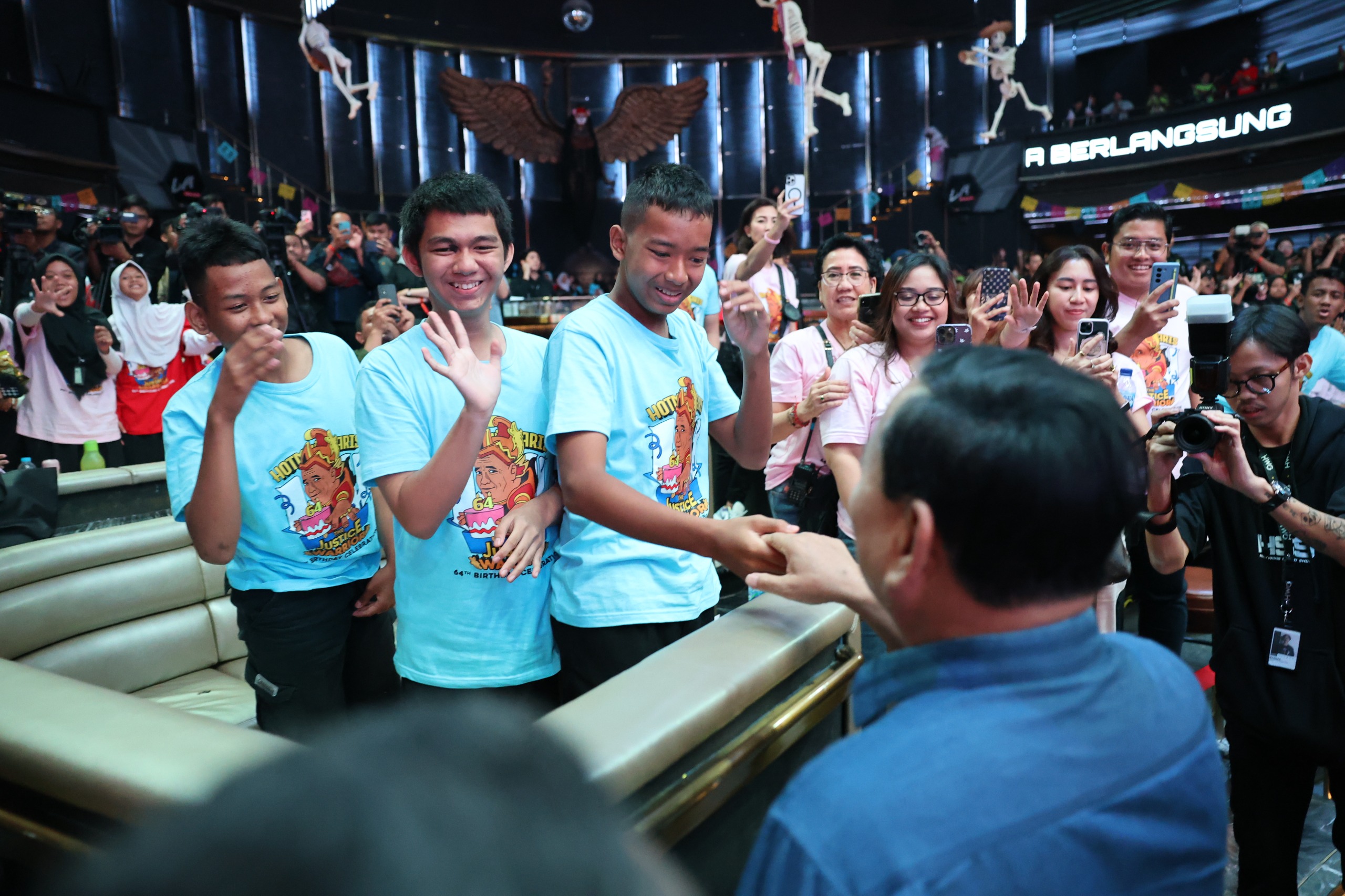 Bakal Calon Presiden (Bacapres) Prabowo Subianto hadiri undangan perayaan ulang tahun Hotman Paris Hutapea ke-64, yang turut dipartisipasi oleh 600 anak disabilitas di The H Club SCBD, Jakarta, Jumat (20/10).